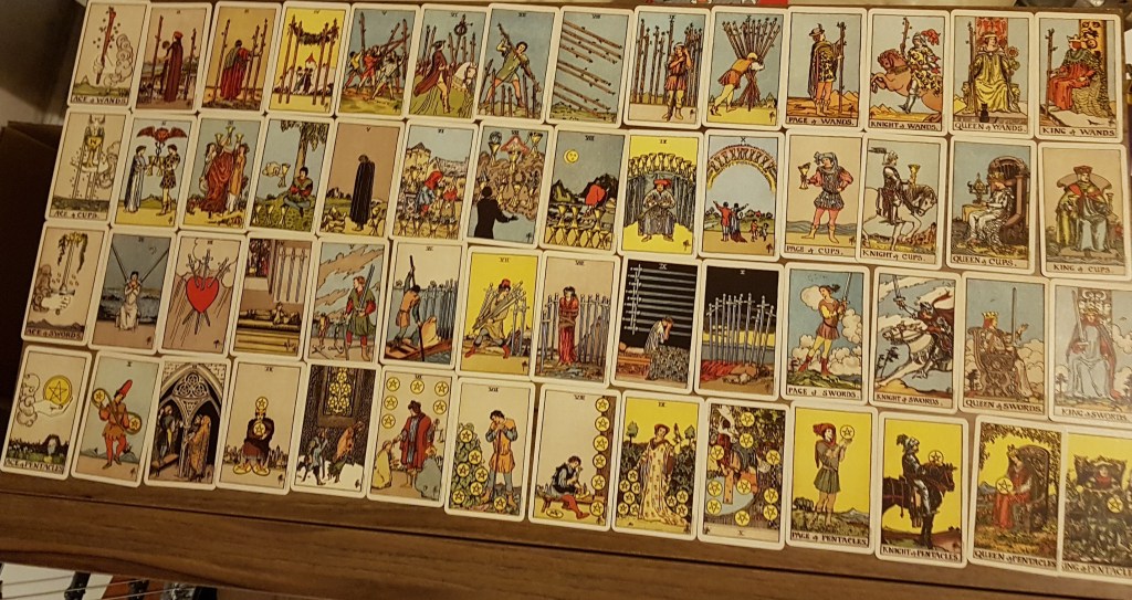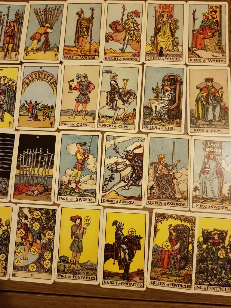 It may seem overwhelming to learn the meanings of each of these cards, but I’m going to try to categorise them to make it easier. Each suit has a meaning, and each number, ace to 10, page, knight, queen and king has a meaning. You can combine these to greatly reduce the memorisation needed. This will make more sense later, so please don’t worry if you’re confused just now. Also remember that the Minor Arcana tend to represent more mundane matters than the Major Arcana.