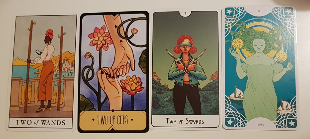 Two of Wands: The two wands surround the woman in this card like a doorway or a gate. She looks out as if she is contemplating what to do next. She looks almost bored, fed up of what her life is like just now. The Two of Wands tells us to combine that fiery wands energy with a plan and some solid decision making. In the Rider-Waite-Smith version of the card, the character is holding a globe in his hand. He can do anything, go anywhere, but must ensure he can follow through and not impulsively follow whatever comes along first.