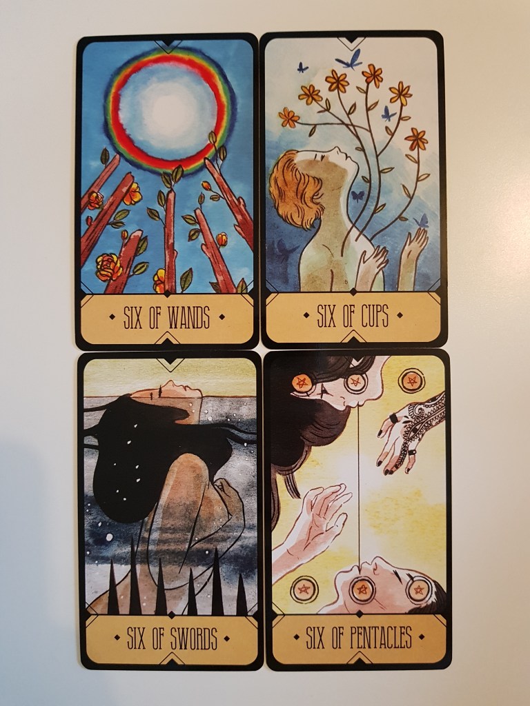 What do you think when you pull a Six? Now we are in the second half of the Minor Arcana journey, what has resonated with you most? I’ll remind you that it’s good practice to keep a tarot journal: pull a card a day and see what you intuitively read from that card. Then look up the meaning and think about how you could use that card today. Keeping notes of these readings is a good way to consolidate any insight you get from the cards.