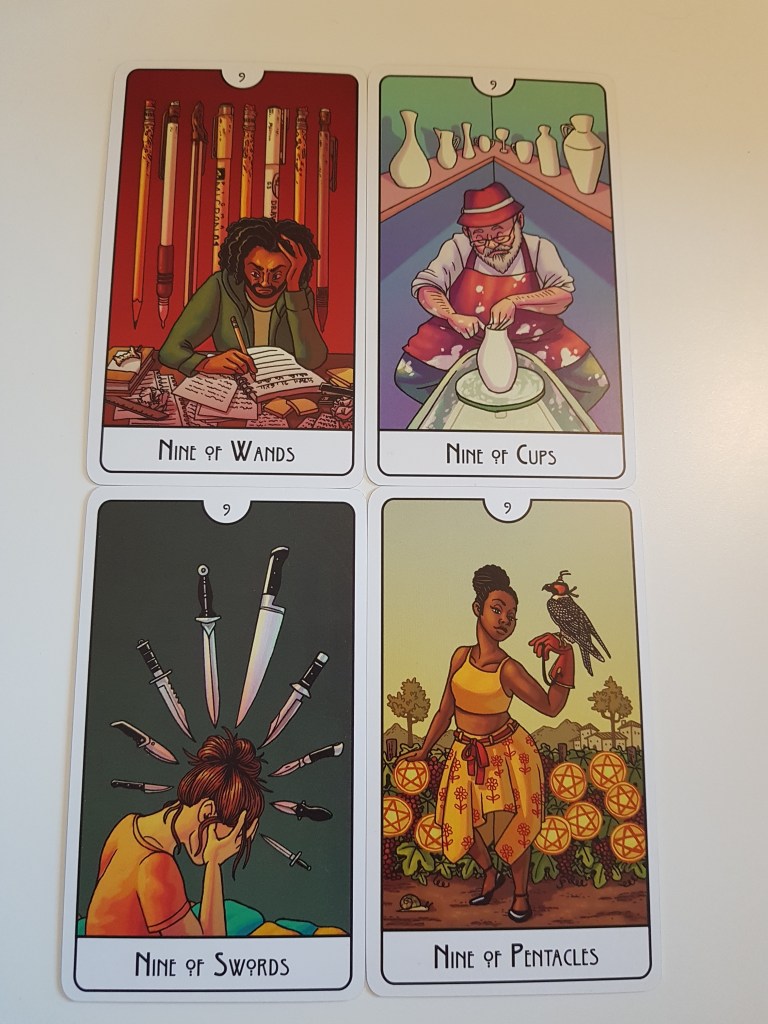 It feels like I’m being called out if I’m procrastinating and pull a Nine of Wands. The Nines cards all ask you to do the work, the kind of work depending on which one you pull. Work isn’t just what you do to make money, it’s also working on yourself to improve your mental health, or working on your relationships so that they go as smoothly as possible.